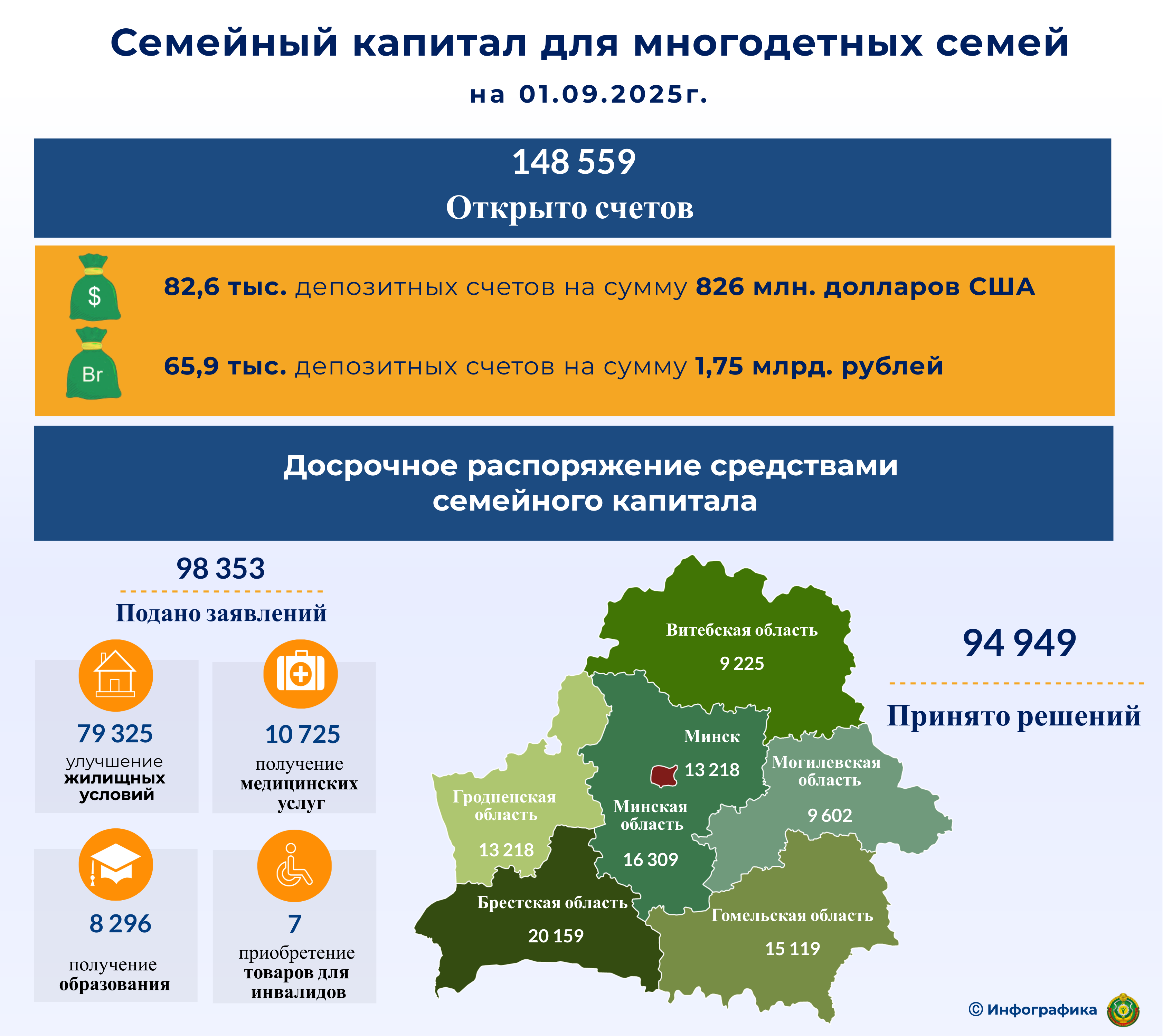 На 1 сентября 2025 г. для многодетных семей открыто 148 559 депозитных счетов «Семейный капитал»: 82,6 тыс. депозитных счета на сумму 826 млн. долларов США 65,9 тыс. депозитных счетов на сумму 1,75 млрд. рублей По состоянию на 1 сентября 2025 г. на досрочное распоряжение средствами семейного капитала подано 98 353 заявления. Из них на цели улучшения жилищных условий – 79 325, на получение медицинских […]