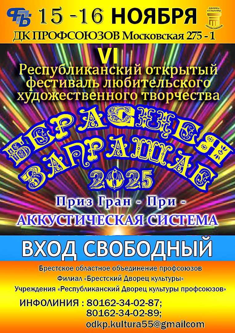 Фестиваль любительского художественного творчества «Берасцея запрашае!» состоится 15-16 ноября в Брестском областном Дворце культуры профсоюзов. Как сообщила директор областного дворца культуры профсоюзов Светлана Семашко, 15 ноября участники фестиваля представят свои номера в номинациях «Вокал» и «Хореография», 16 ноября проявят себя в номинациях «Инструментальное творчество», «Театральное творчество», «Изобразительное и декоративно-прикладное творчество», «Театры моды», «Оригинальный жанр». Гала-концерт […]